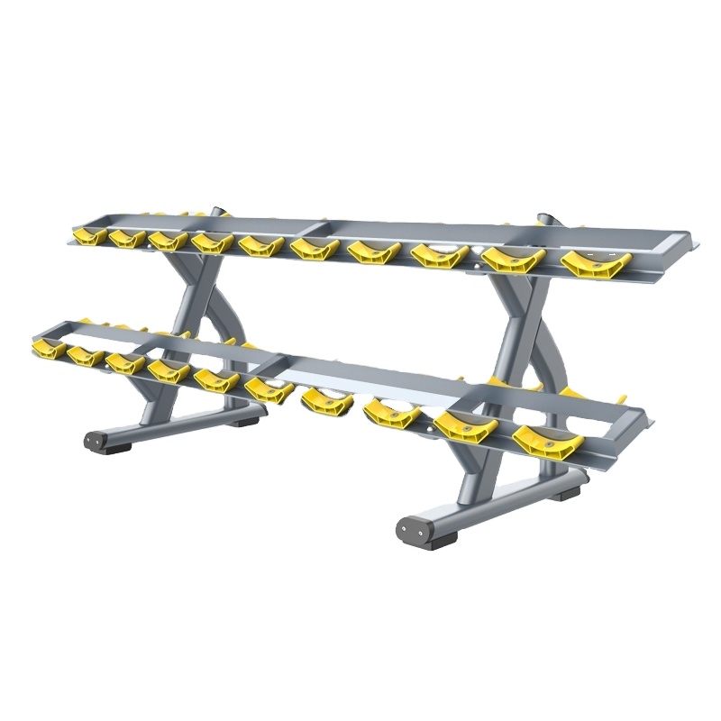 Компактная двухъярусная конструкция: новая двухуровневая конструкция эффективно сокращает вдвое площадь, необходимую для хранения полного набора гантелей, по сравнению с одноярусными стойками, что является решающим преимуществом при планировке помещений коммерческого спортзала .