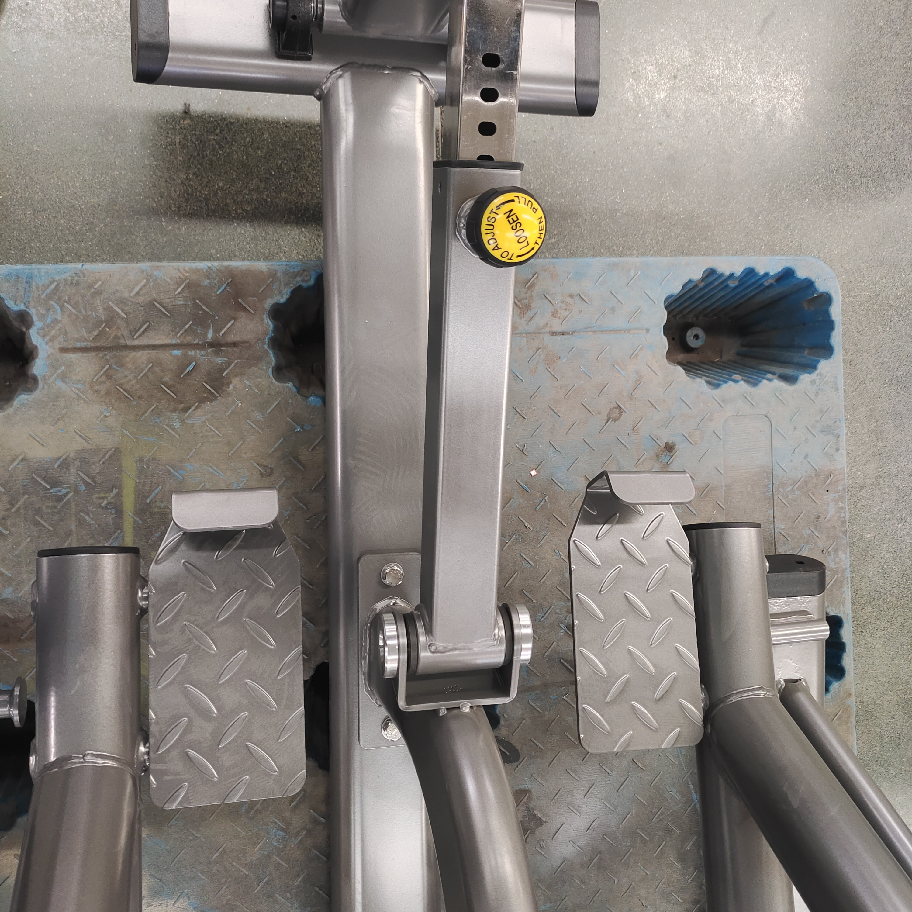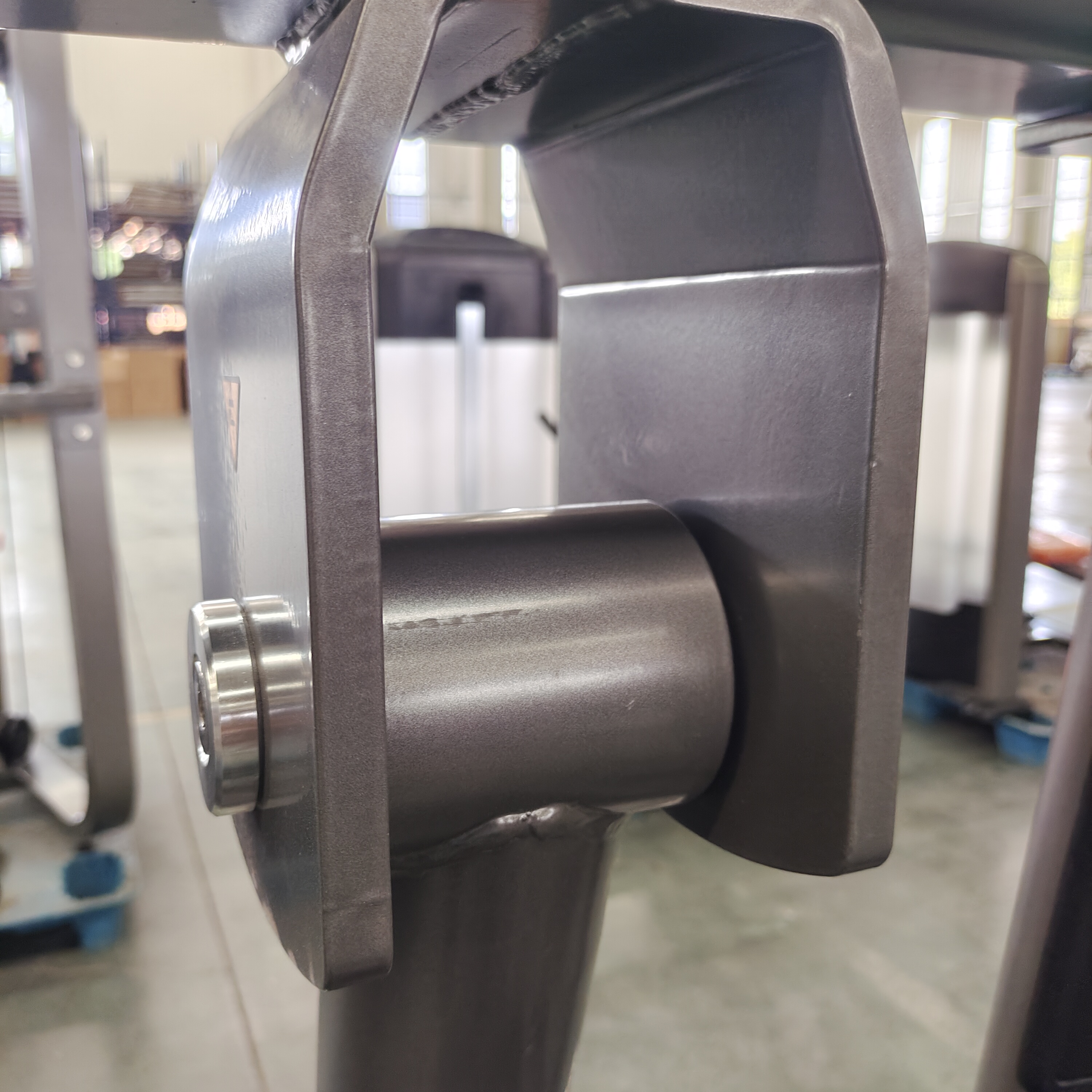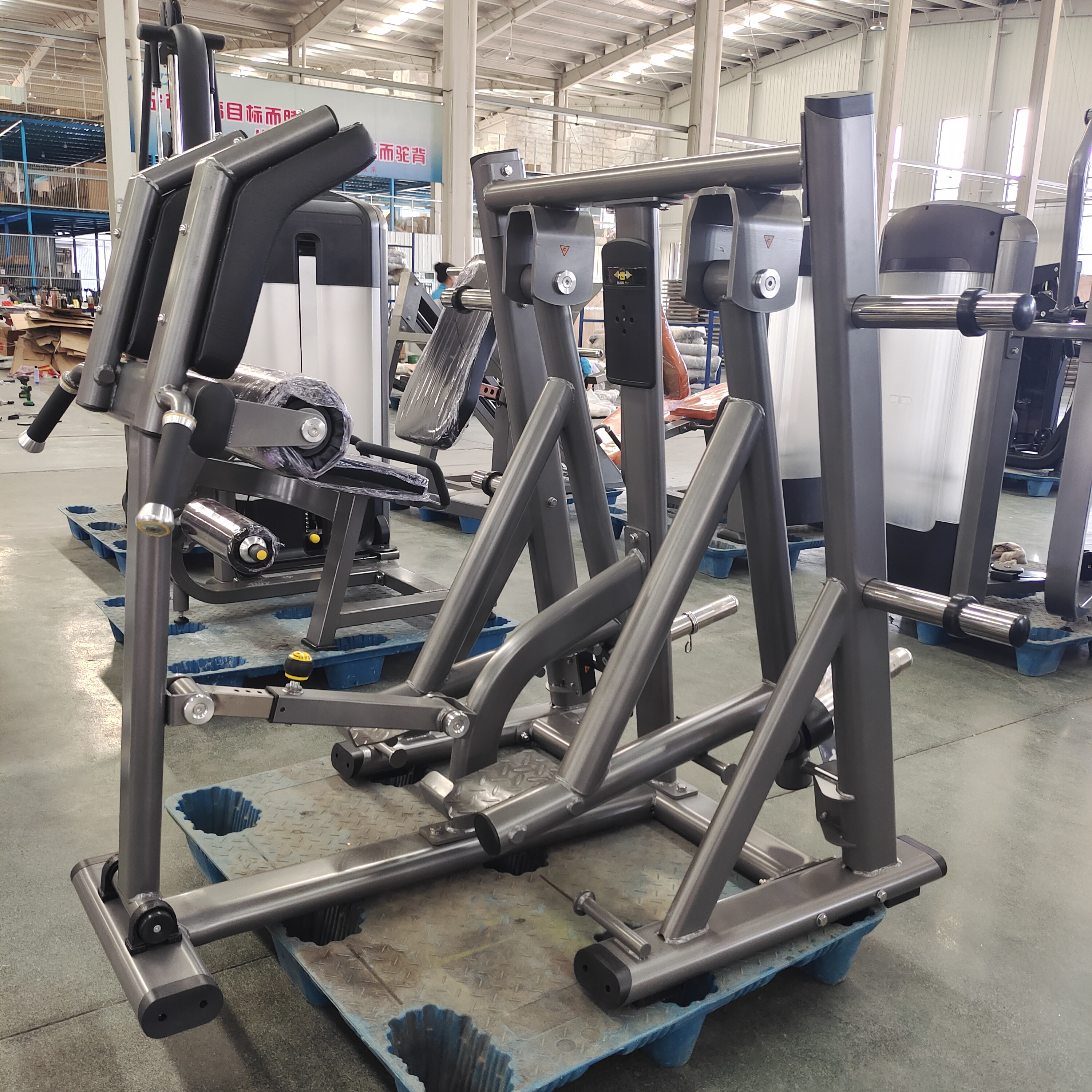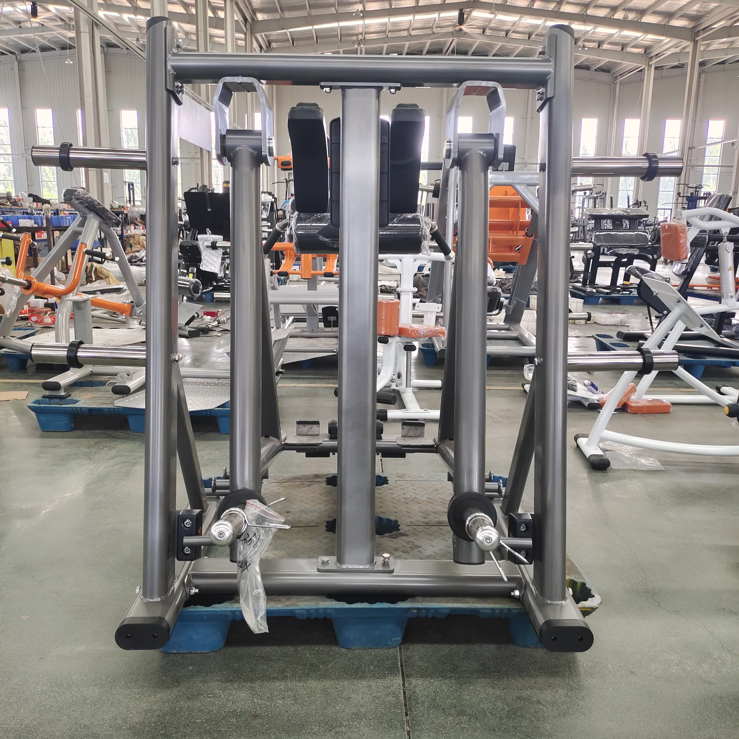 Прочная конструкция: при значительном весе нетто 168 кг рама машины, изготовленная из плоской эллиптической (120x60x3 мм; 100x50x3 мм) и круглой (диаметр 76x3 мм) трубы , гарантирует непоколебимую устойчивость во время тяжелых толчков и разгибаний бедра.